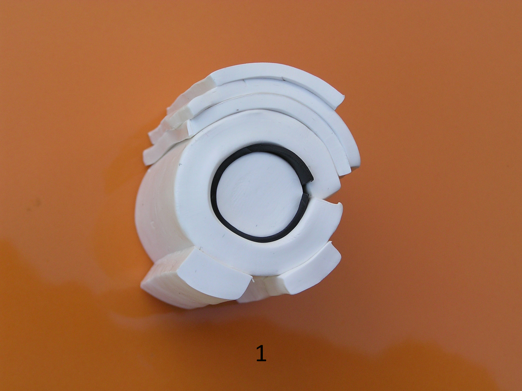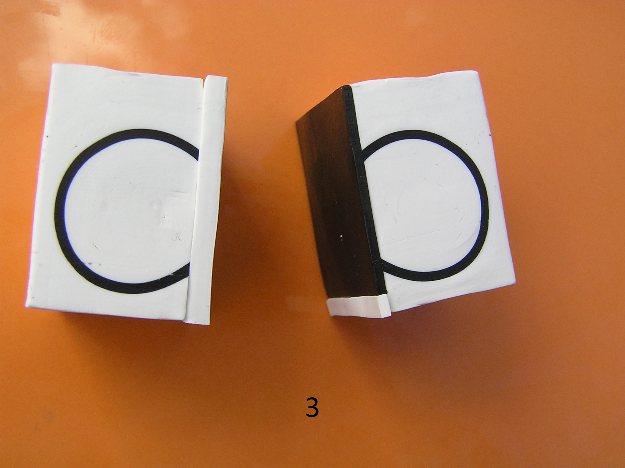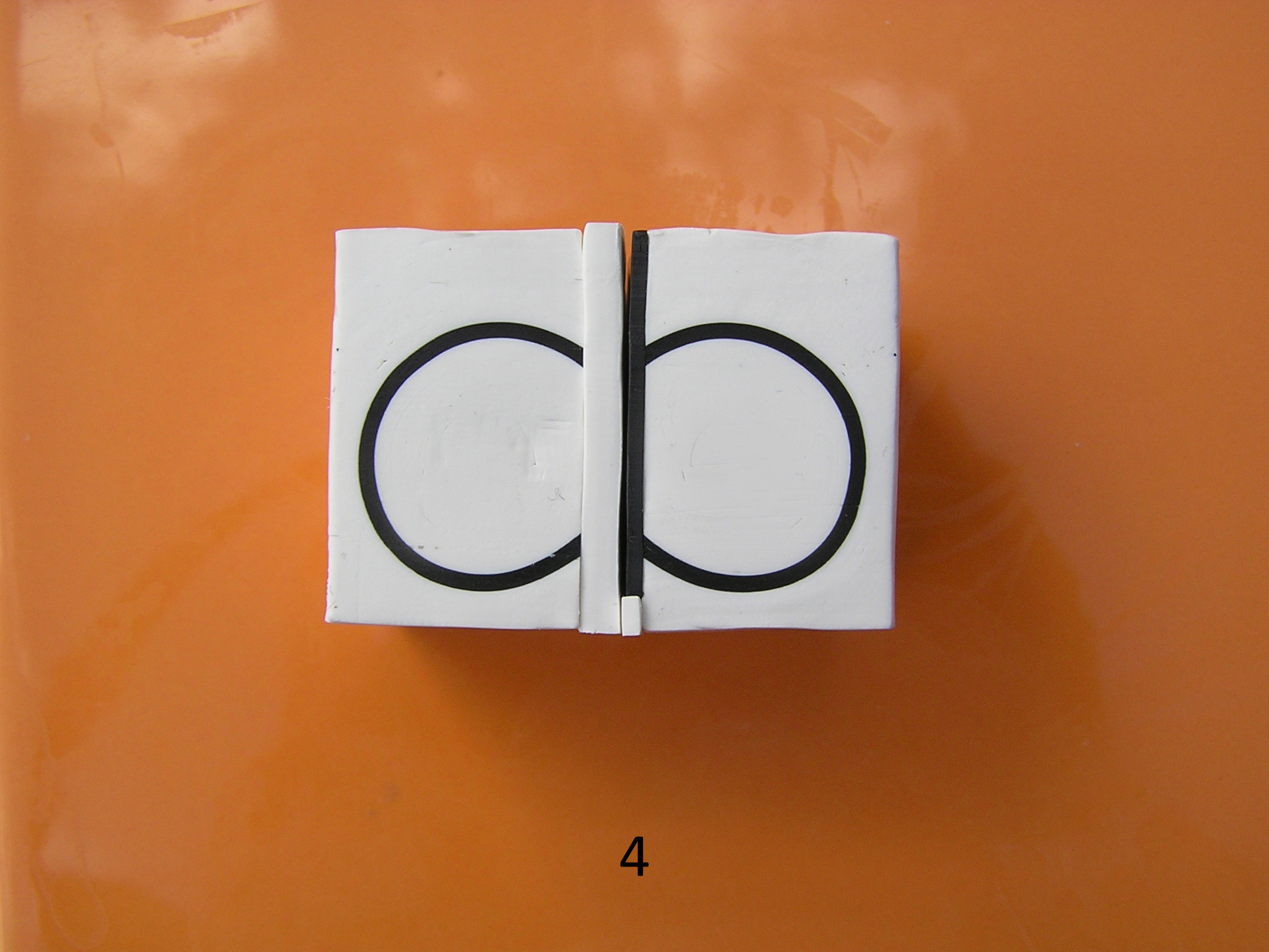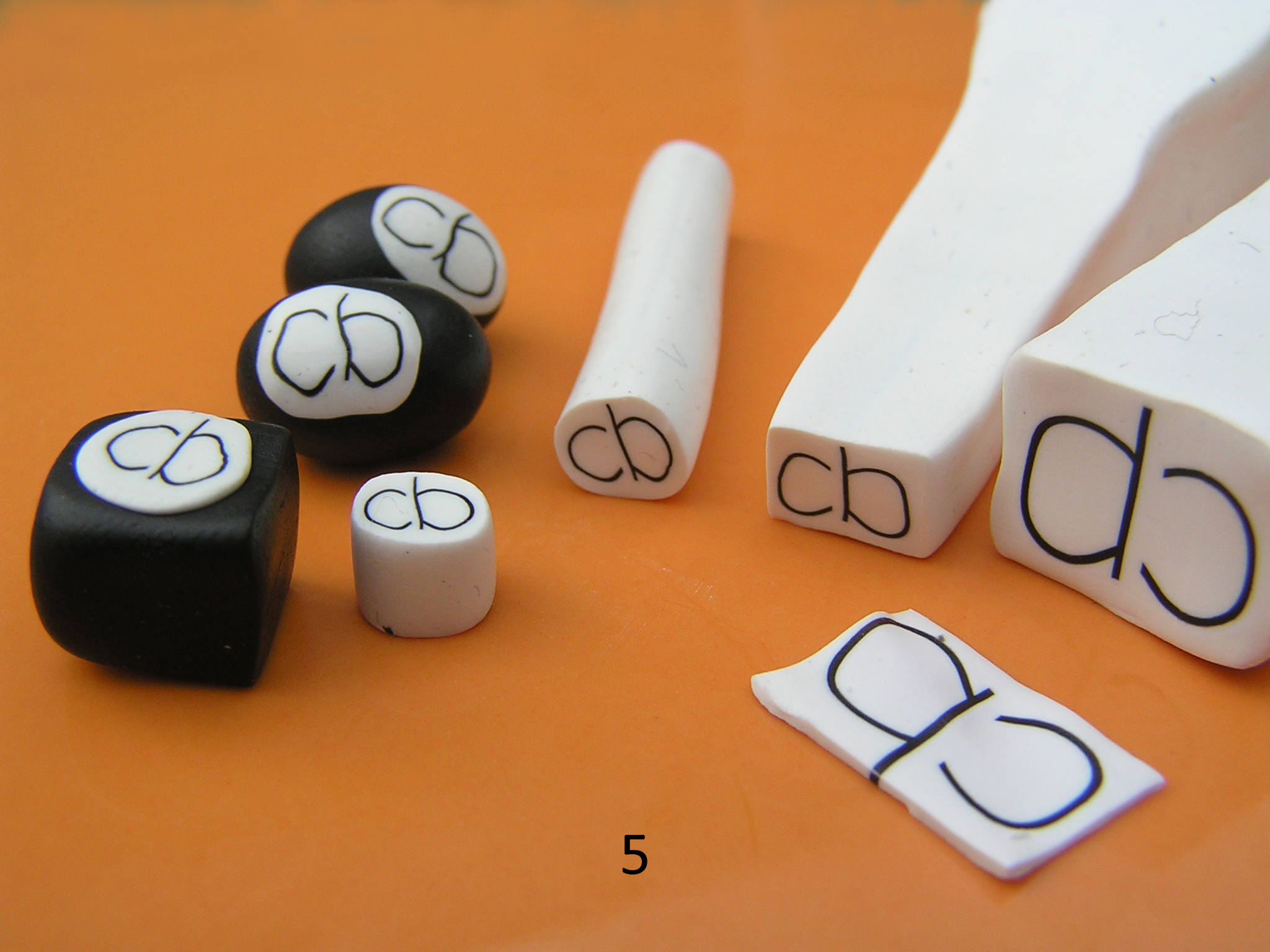 Some letters will be more difficult than others, but my “cb” cane gives a general idea of how it’s done.  The pictures show a roll of white wrapped with a thin sheet of black then  packed with more thick sheets and pieces of white  (1).  The extra white is cut off, as is a small part of the black circle, to leave a white square with a black  “c”  (2).  This is cut in half (crossways) – to give two identical halves – one half for the “c” and the other half for the “b”.  A thick piece of white is added to the “c” half for the gap between the letters, then a thin sheet of black to make the “b” half (3).  This is then put together (4) and reduced, so I have slices of different sizes to add to beads or to other work (5).  A bit more patience before reducing the cane would have reduced the slight distortion in the final result.