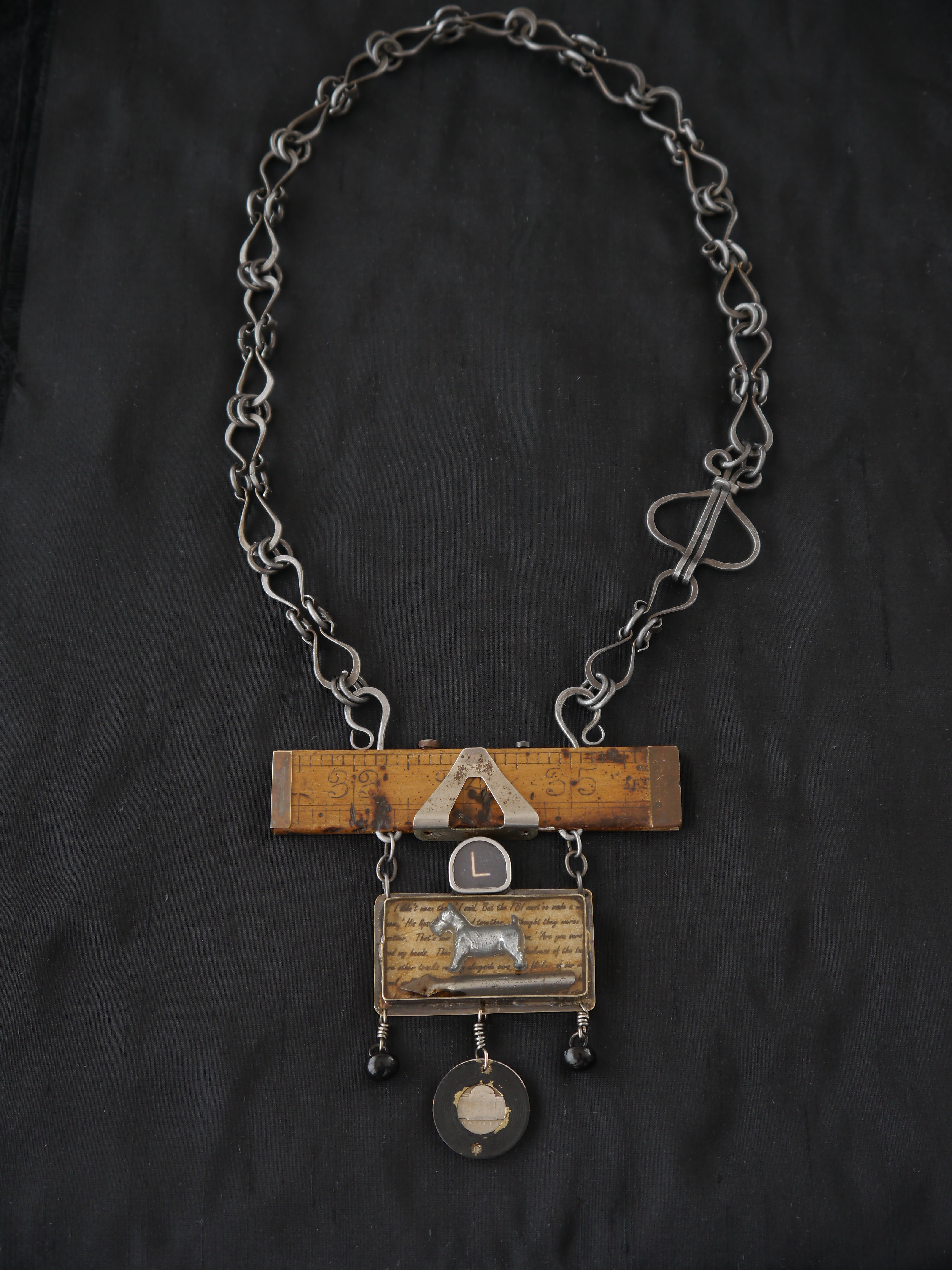 Lucy pendant full view Published July 28, 2013 at 3456 × 4608 in Pendant for Lucy Brass, steel wire, silver wire, monopoly piece, pen nib, vintage ruler, boot buttons, coin, camera parts.
