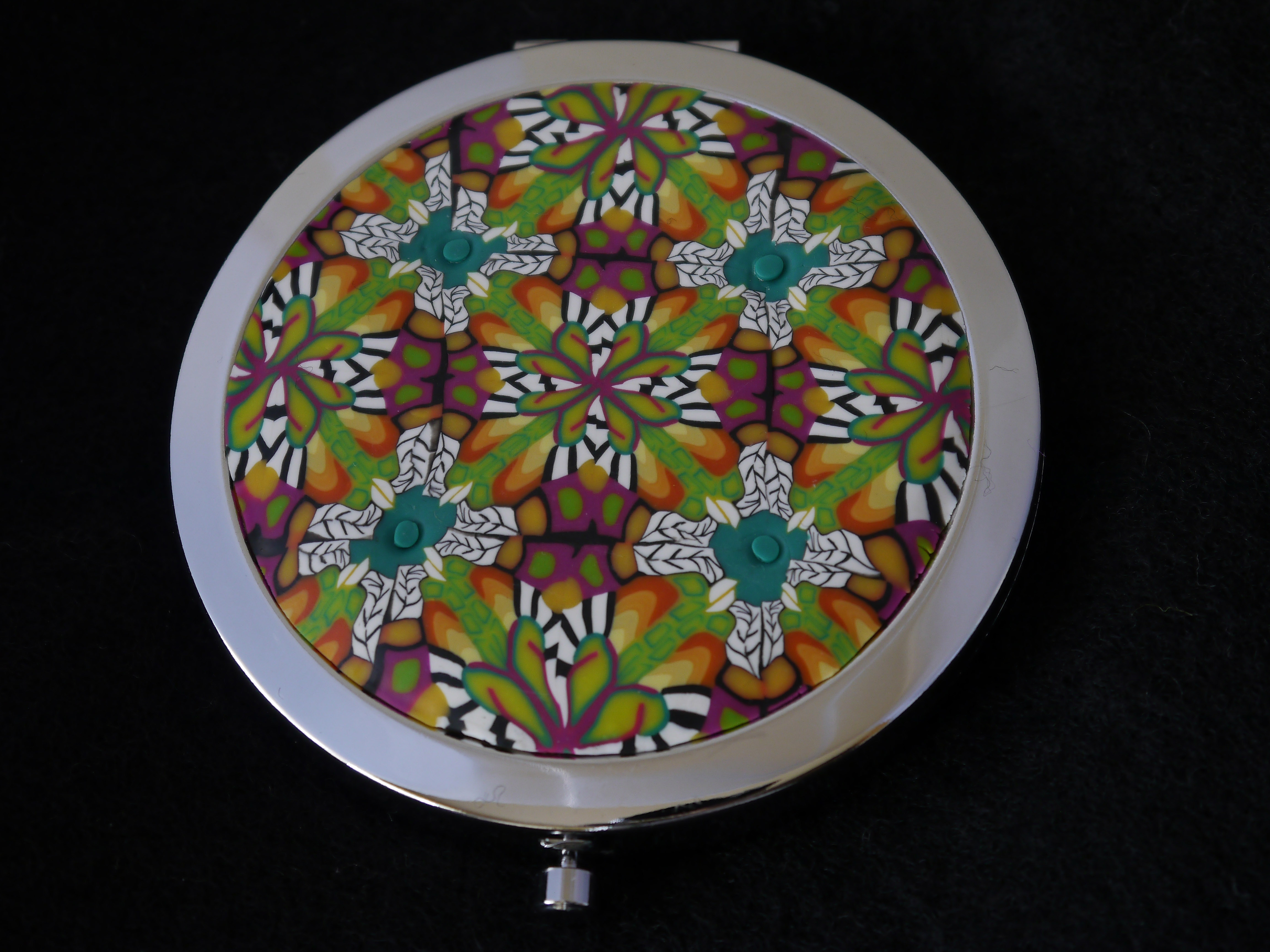 purse mirrorI took very simple canes – bulls-eyes, stripes, squares and a basic leaf, and packed these together to form a triangular cane (below left).  This was reduced and cut 8 times to form the kaleidoscope cane (in the middle of picture below right). Thin slices are then used to cover a blank purse mirror  – after first covering the metal with PVA glue (which is allowed to dry) I use liquid polymer clay for a strong bond.