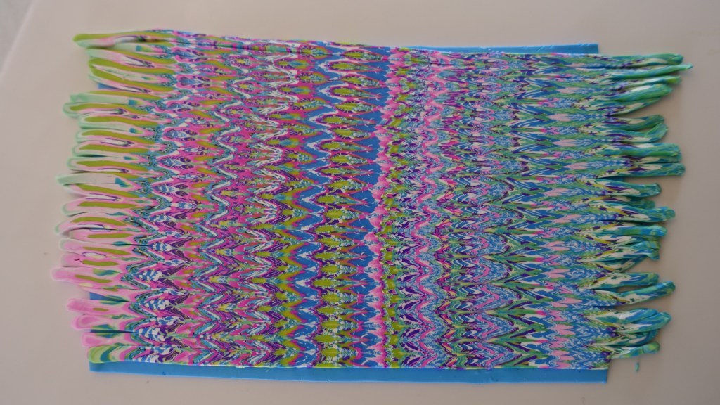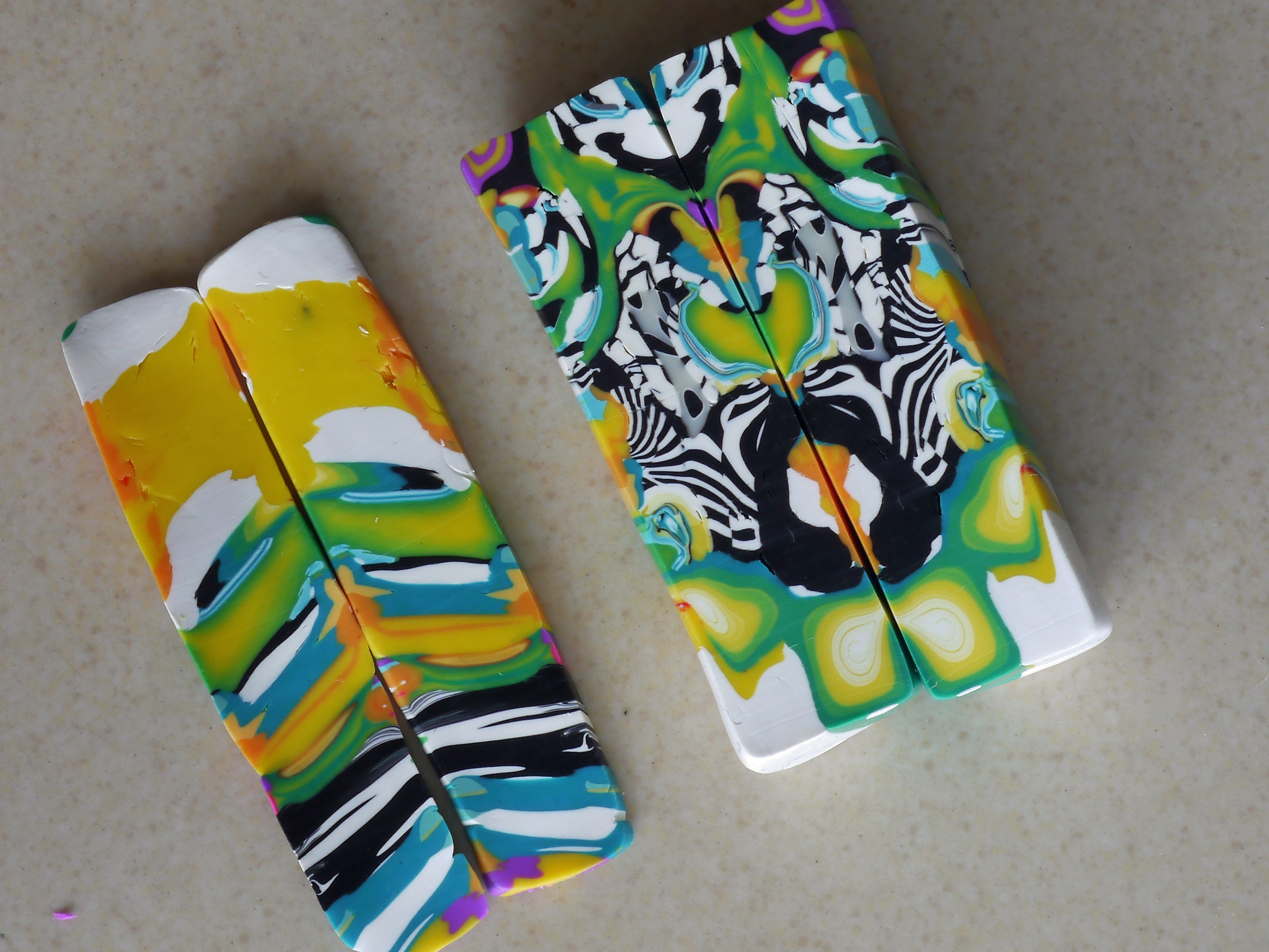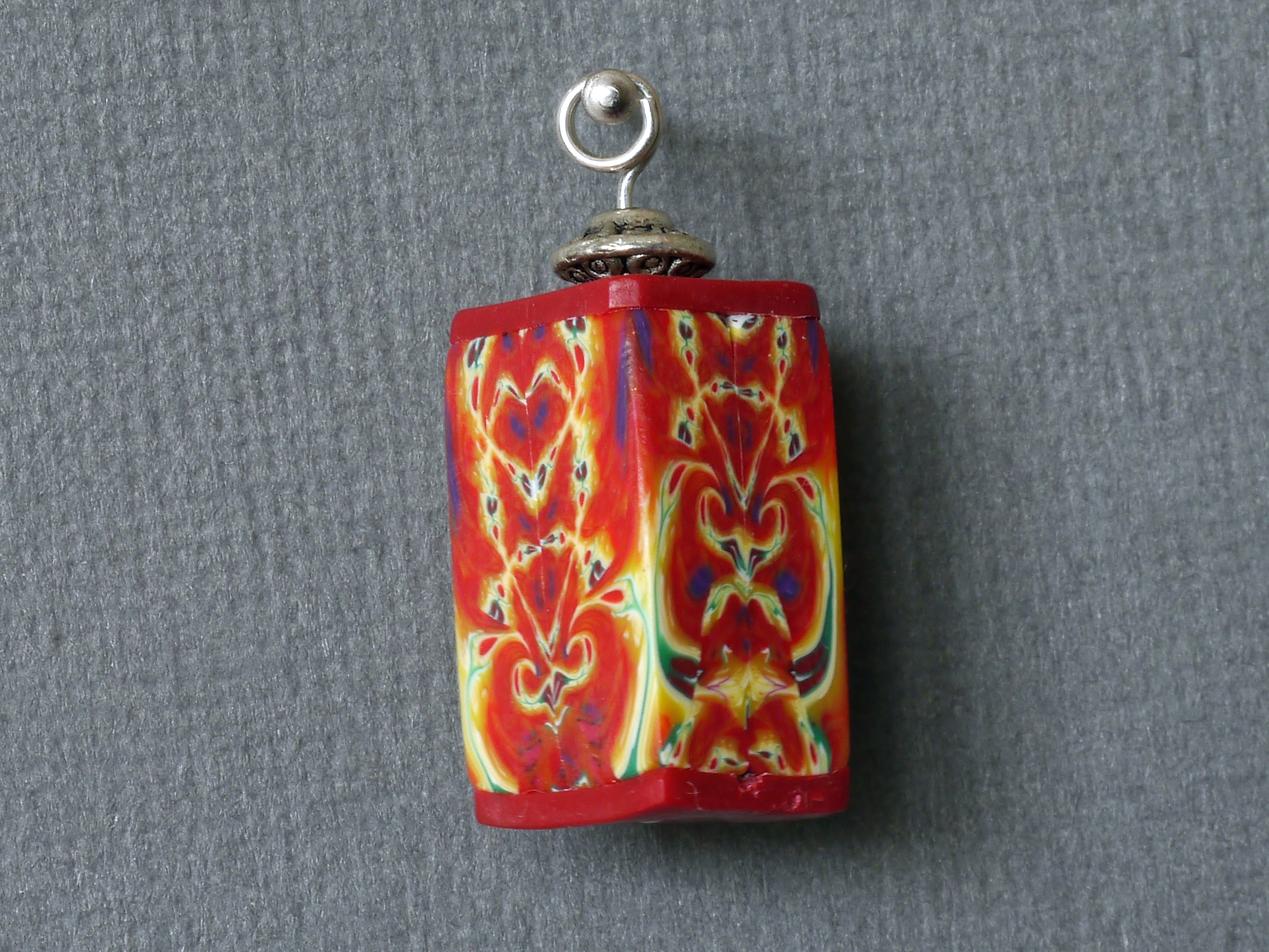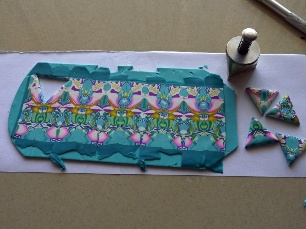 This is my friend Donna’s name for the wider slices. I’ve heard the finer pattern referred to as “micro-Natasha” technique. Kathy Dummer has lovely examples on her Flickr site. You can make the patterned ‘fabric’ or wider ‘totem’ patterns for earrings etc. You can use any scraps – left-over canes, cane ends, scraps of skinner blends or scraps of various colors – or a combination of all of these.