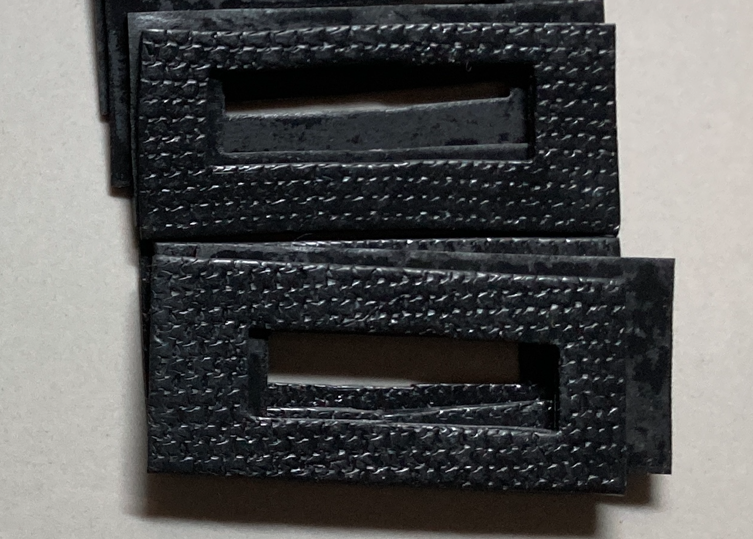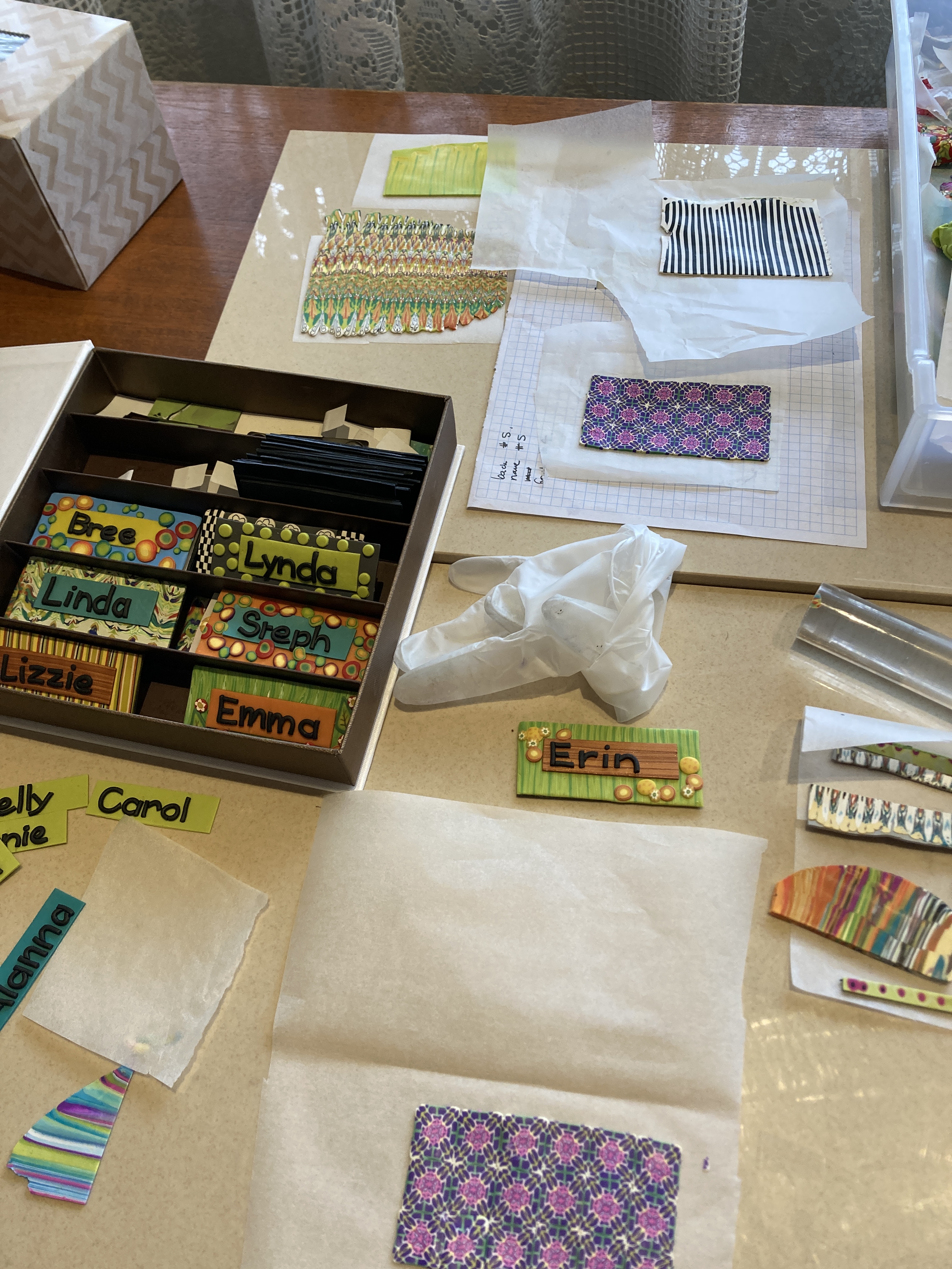 I’ve made over 50 now, mainly using the remains of old projects – some canes were 10 years old. I also used some of the techniques in this post. They are quite light, and use magnets to attach to clothing instead of a pin. The backs (#5 on my Atlas pasta machine) have a gap for the magnets. I extruded black clay to make the names which are on backing also at #5 thickness. The middle patterned section is slightly thicker at #4. I baked the name and the back, then put together with the middle patterned piece with some liquid clay. To stop the badges dropping into the magnet gap, I temporarily put small pieces of thin baked clay, wrapped in paper, in the gap.