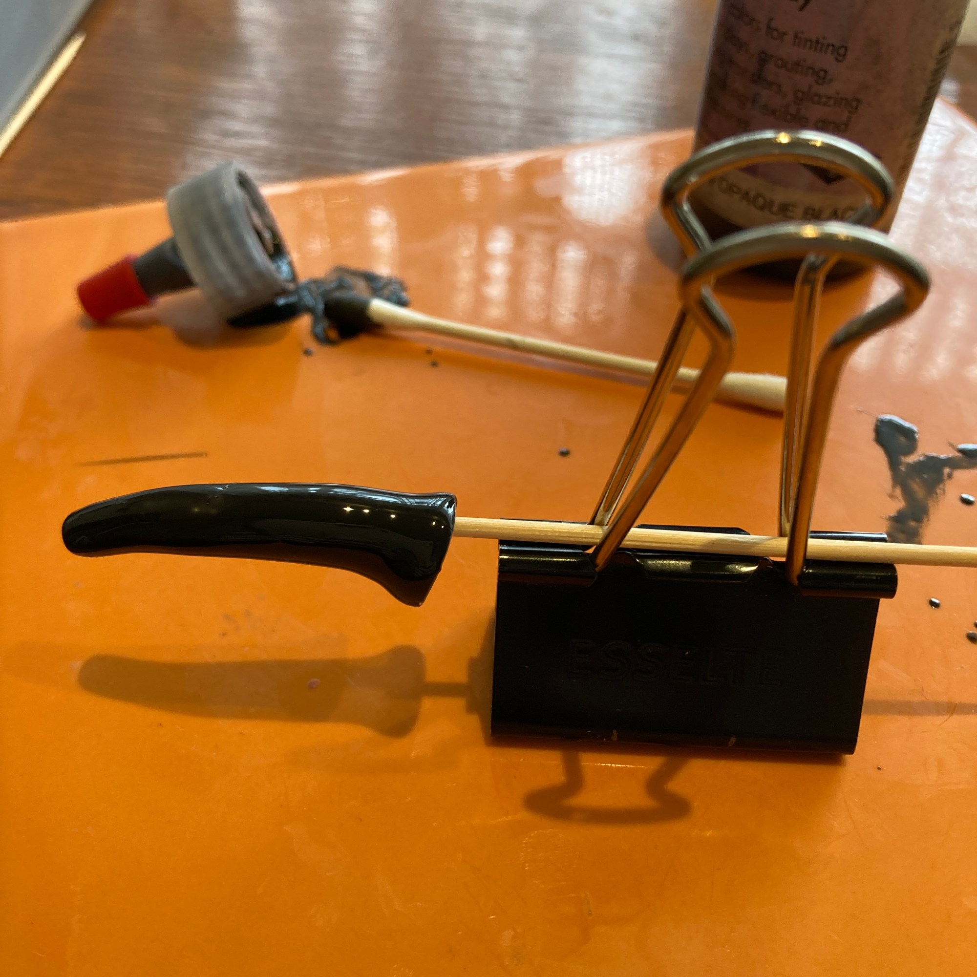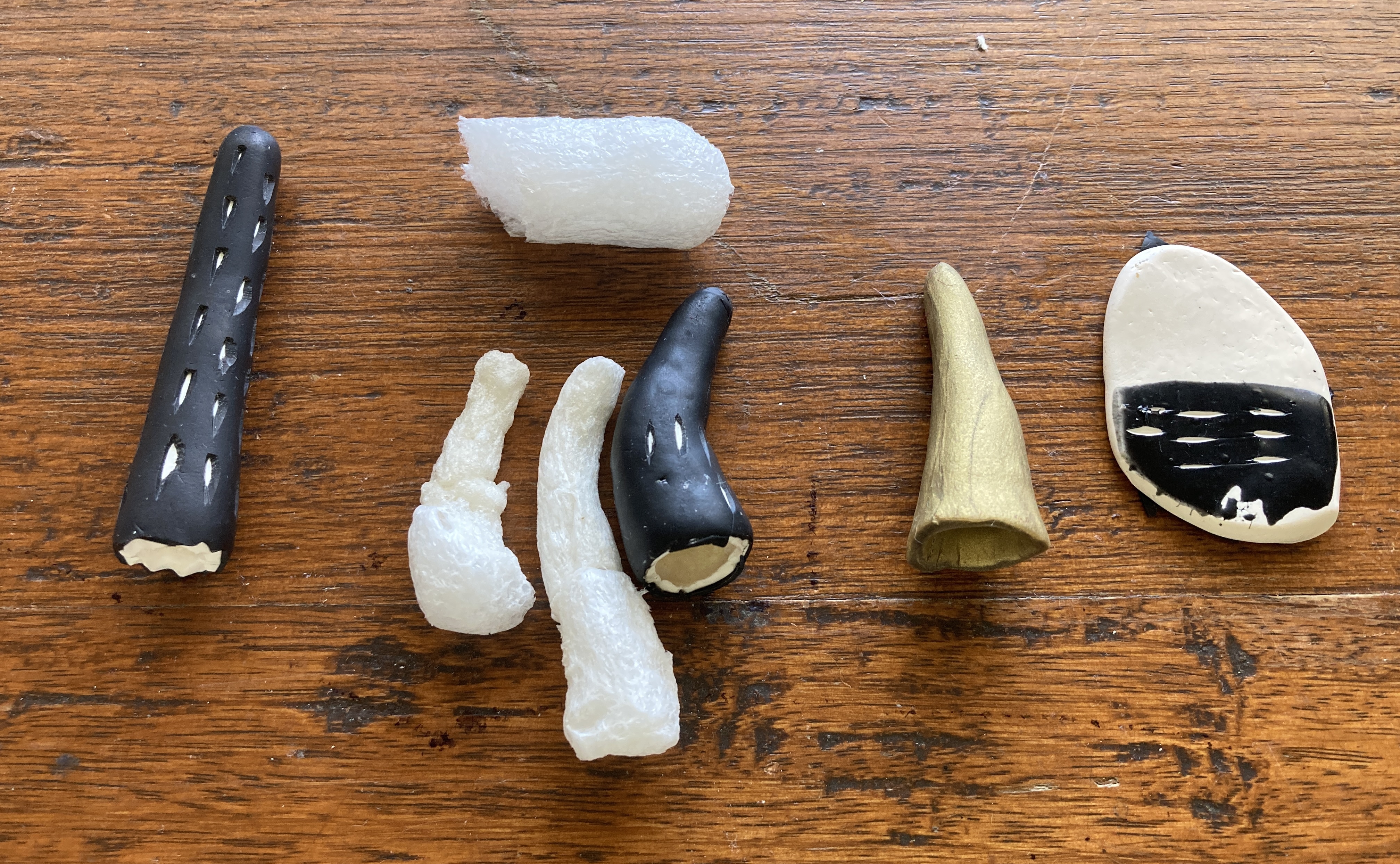 I found the construction quite tricky – particularly keeping the flowers light, while incorporating layers of black and white. The top pieces are quite simple – I mixed colours that matched the fabric, and added small pieces of brown, yellow and black to a slab of grey, rolled it flat then cut out the shapes with a blade. I tried a number of solutions for the ‘trumpets’ – first making a solid shape covered in black clay and hollowing it out with a drill (still a bit heavy), then shaping wet packing peanuts as a mould (not great shapes!), finally making a hollow white shape by hand with the aid of a knitting needle to shape the inside, then painting with black liquid polymer clay before baking. Finally I used a lino cutting tool to make shallow cuts to show through to the white.