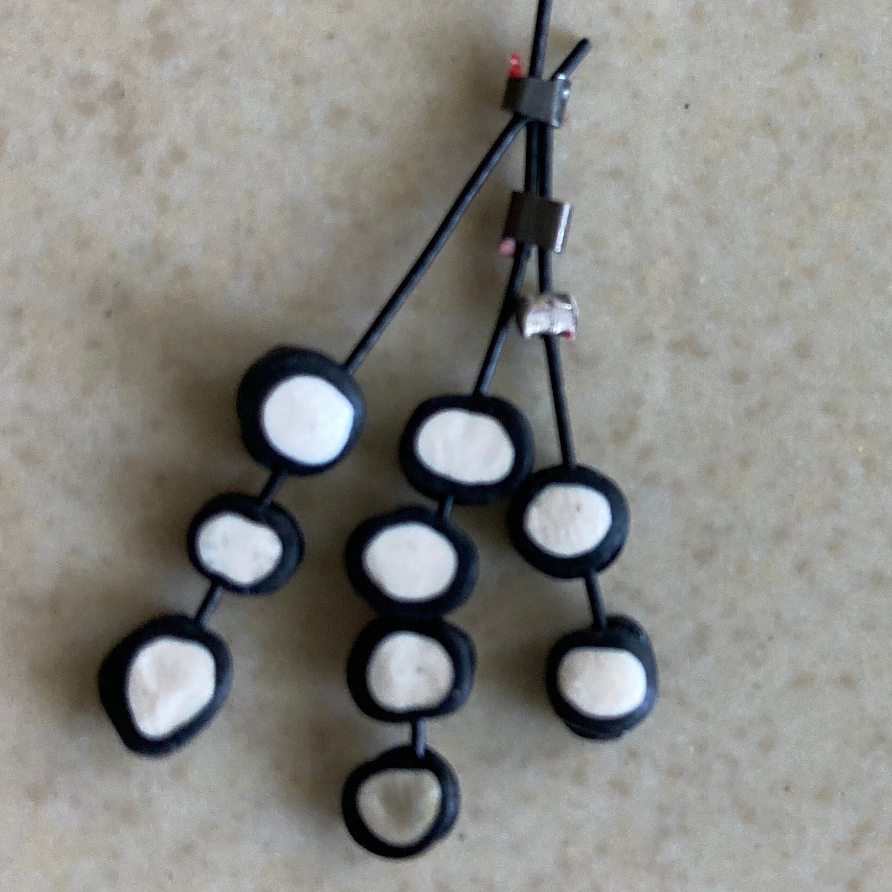 The stamens are black beading wire with crimps (an idea I picked up from an online workshop with Bonnie Bishoff). Some crimps are covered by the black and white circles. Others hold it all together and are embedded into the trumpets, held by a small amount of clay. The small loops at the top that attach to the jump rings are also beading wire secured inside the flower with crimps.