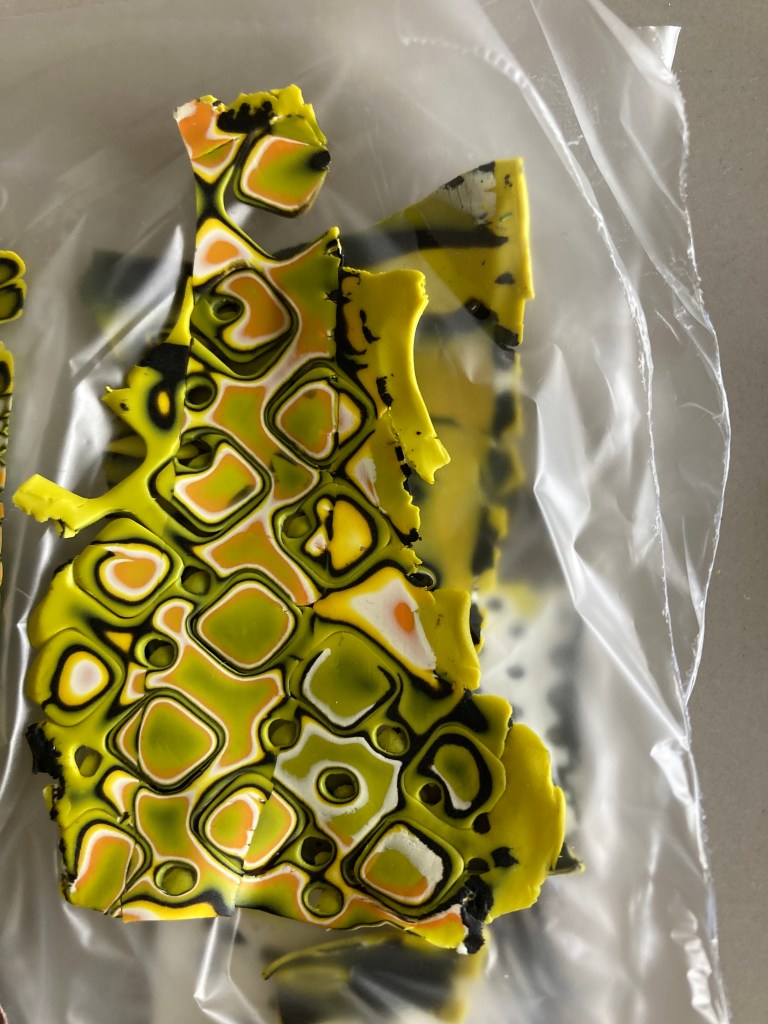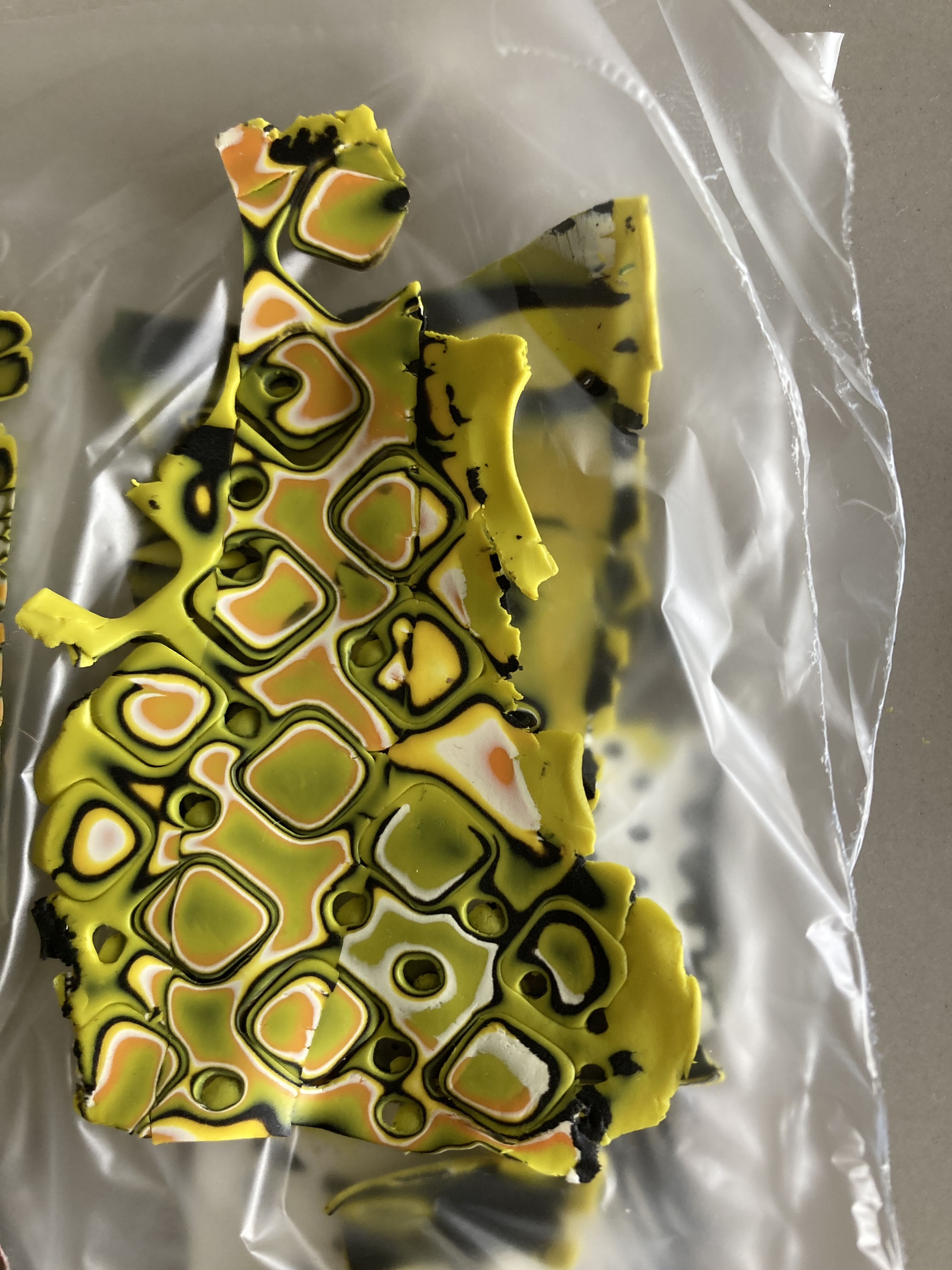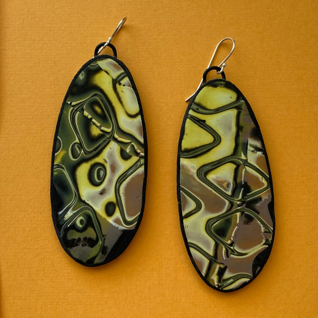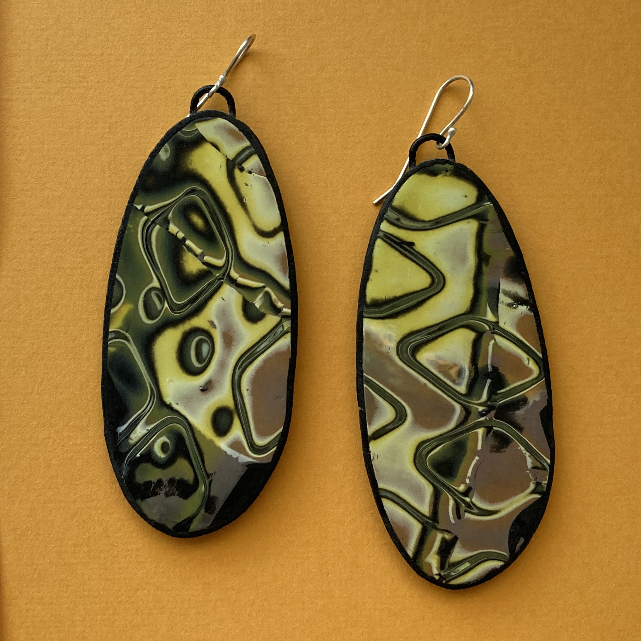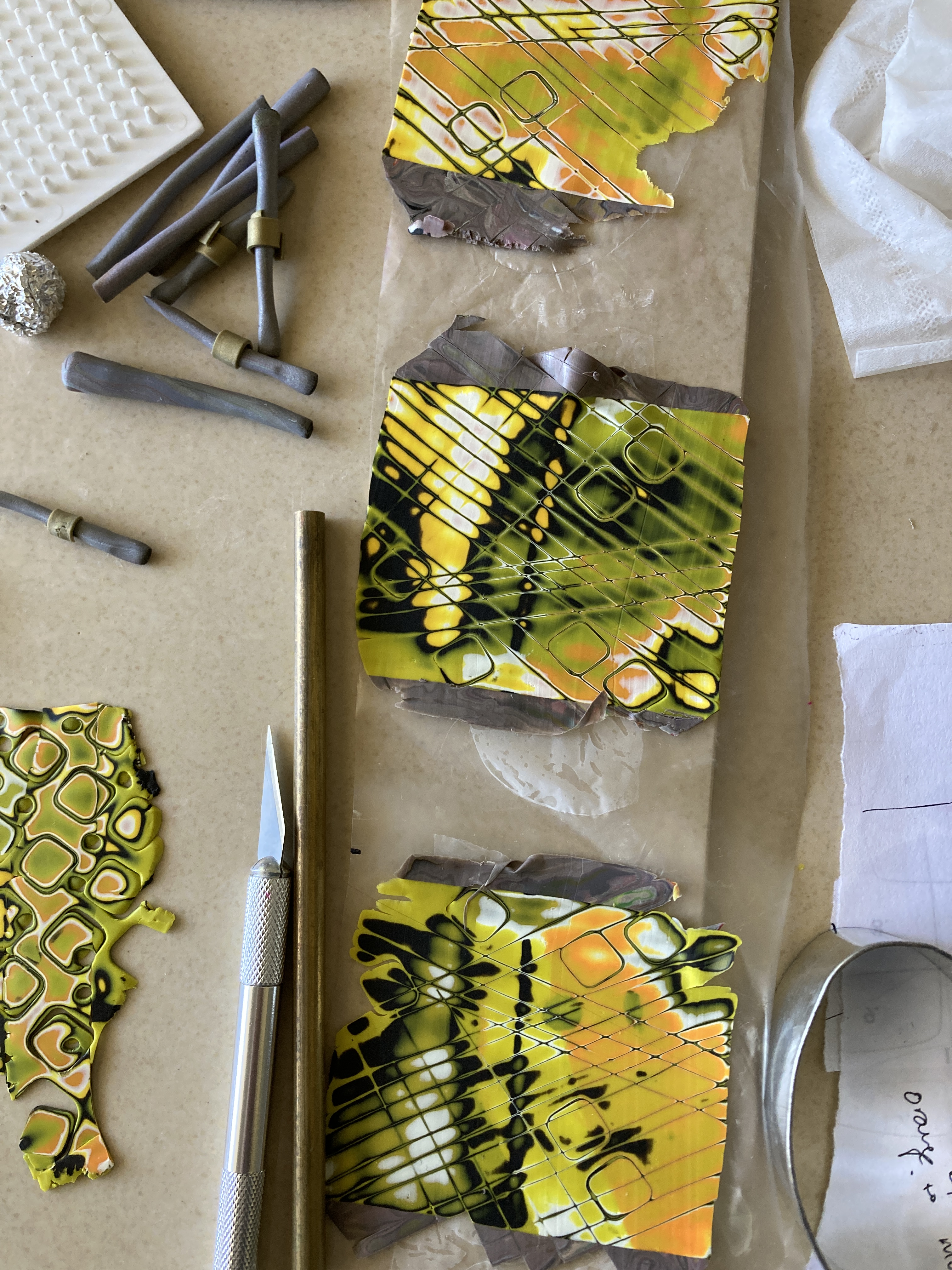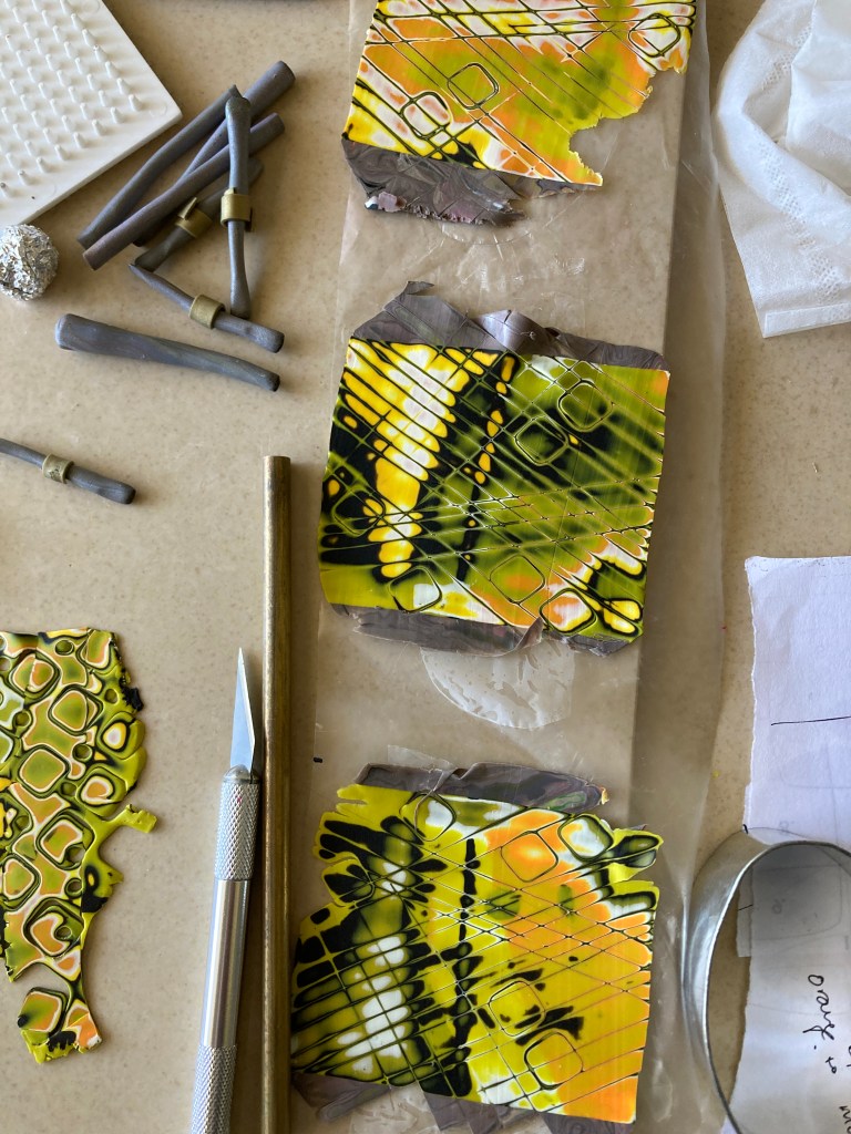 The design can be changed further by placing the thin patterned sheet onto a sheet of clay and rolling it to stretch it out, as I did for the second pair of earrings.