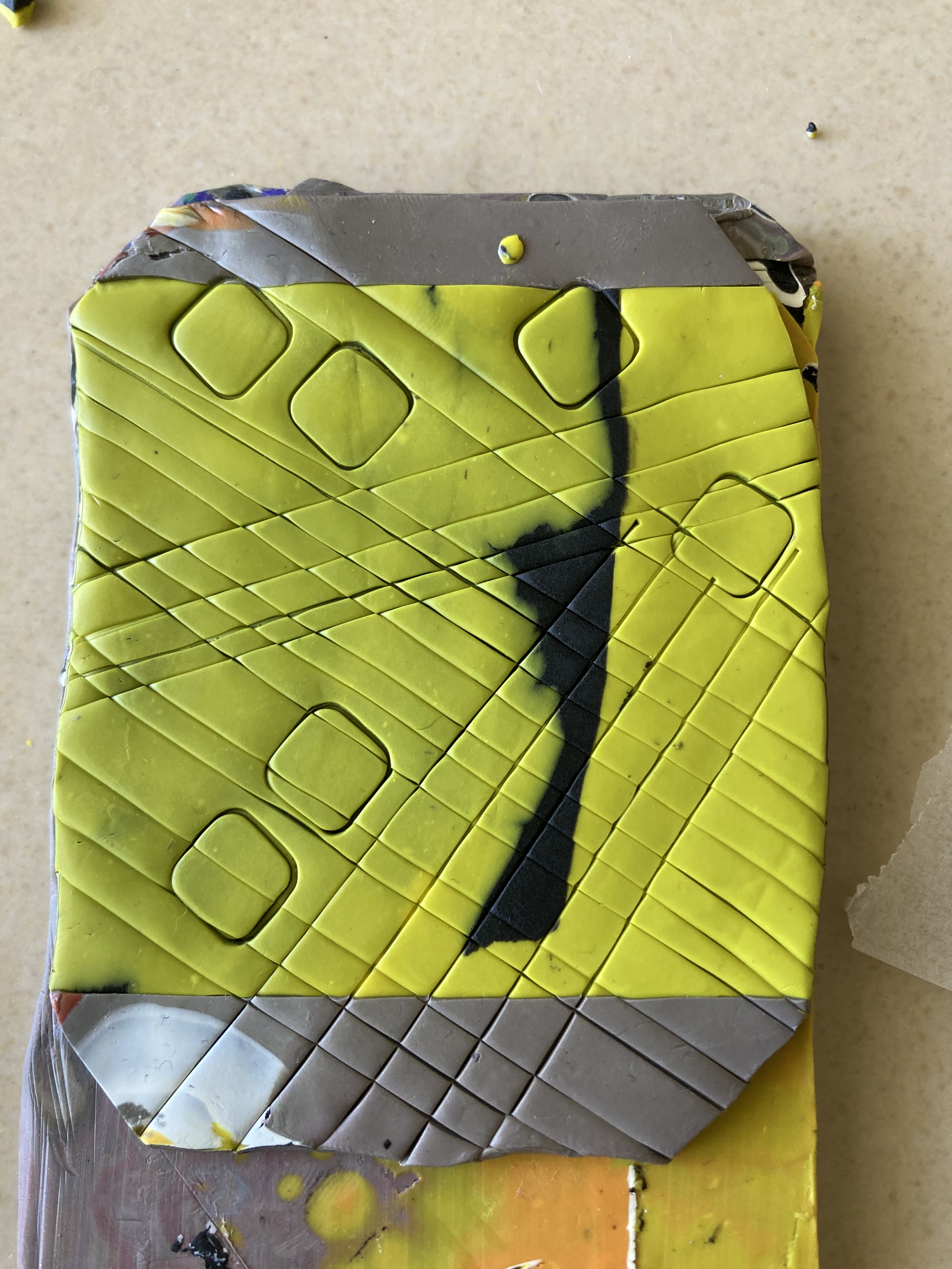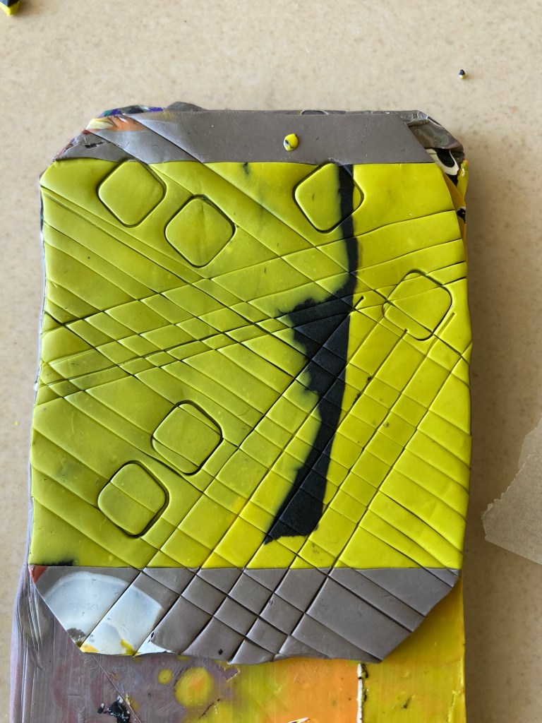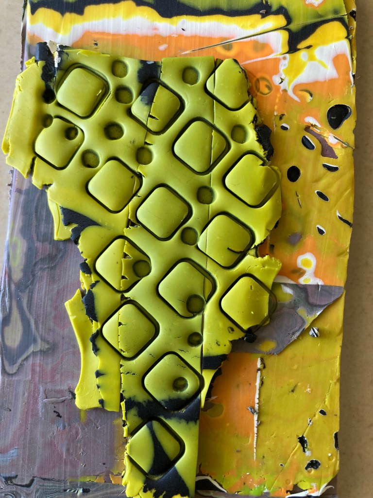Once impressions are made, very think slivers can be removed with a flexible blade, so you can use the sheet of pattern that remains as well as the slivers you’ve removed.