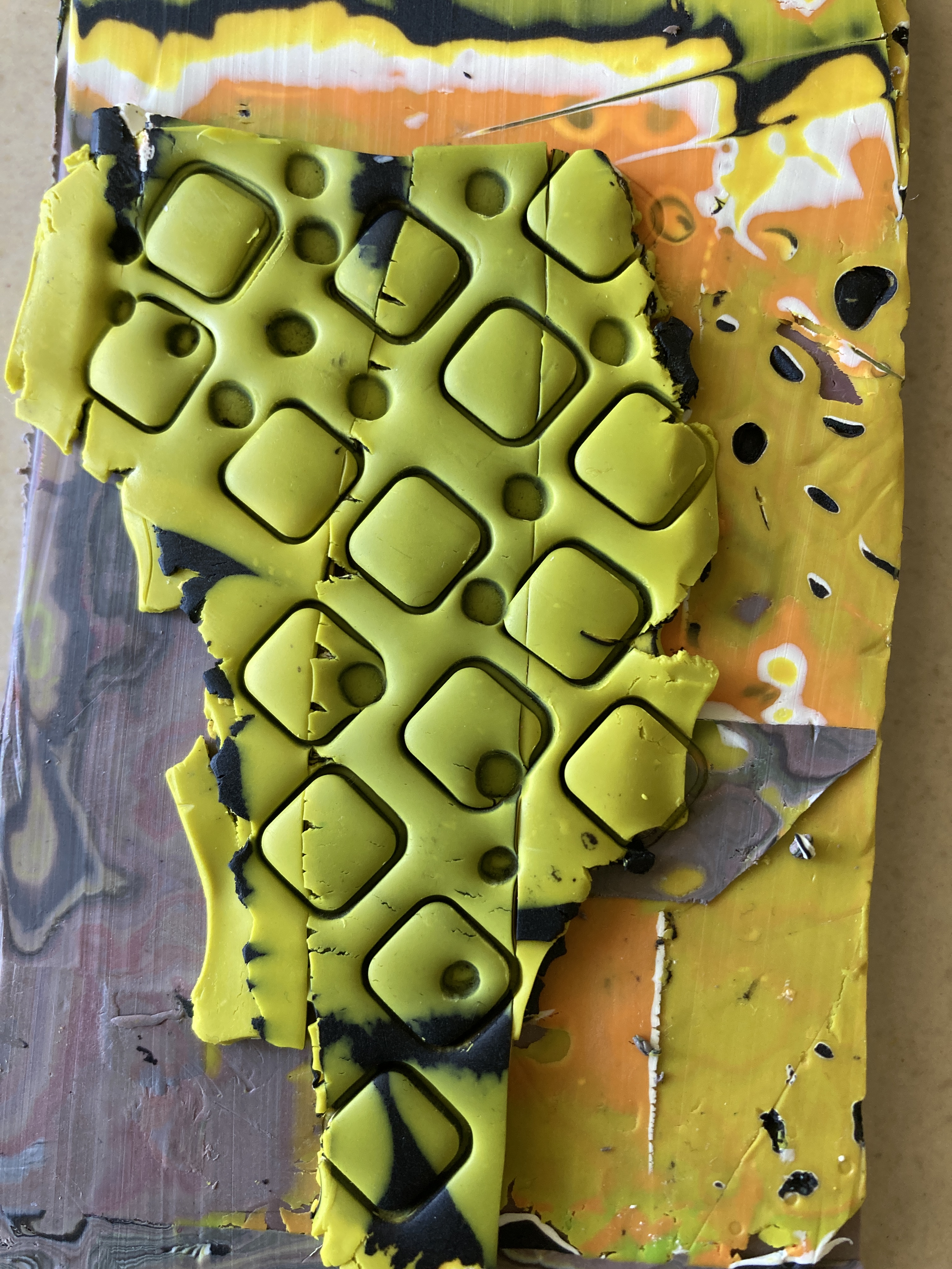 The Mokume-gane technique involves (usually very thin) layers of clay stacked, and impressed with deep stamps, texture sheets or household objects such as knitting needles, pen tops, and various hardware. (The name is based on an ancient metal technique which involves patterns created by cutting into thin layered metal sheets)
