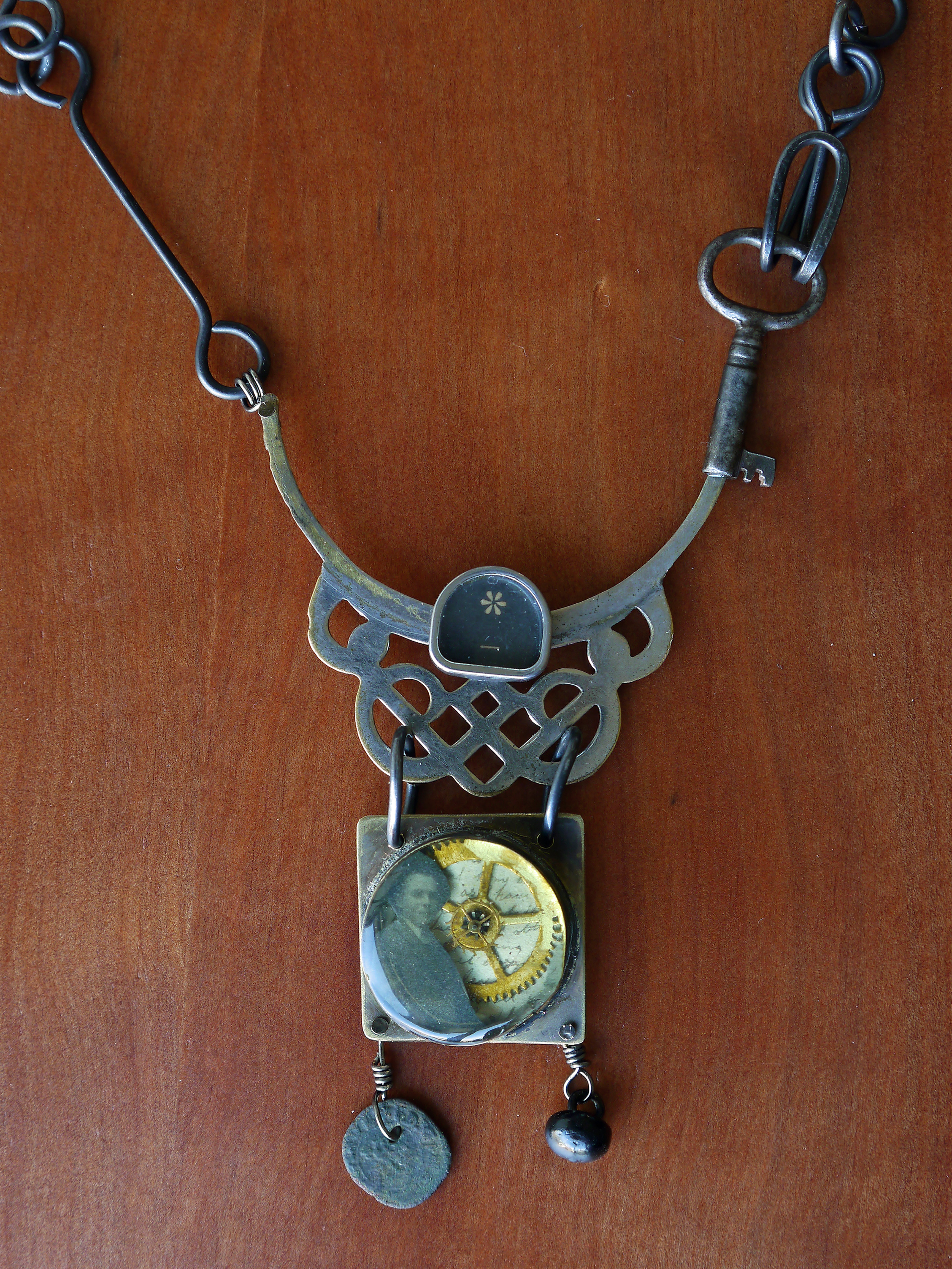 found object pendant 0617 detail Published June 9, 2017 at 3456 × 4608 in found object work Tea strainer part, watch parts, key, old coin, boot button, brass, paper, steel wire Like Loading...