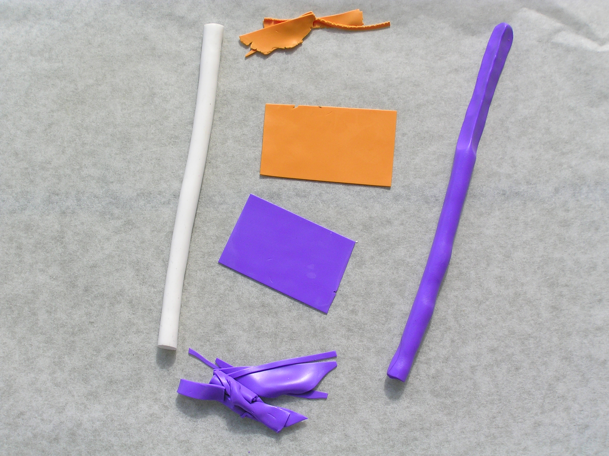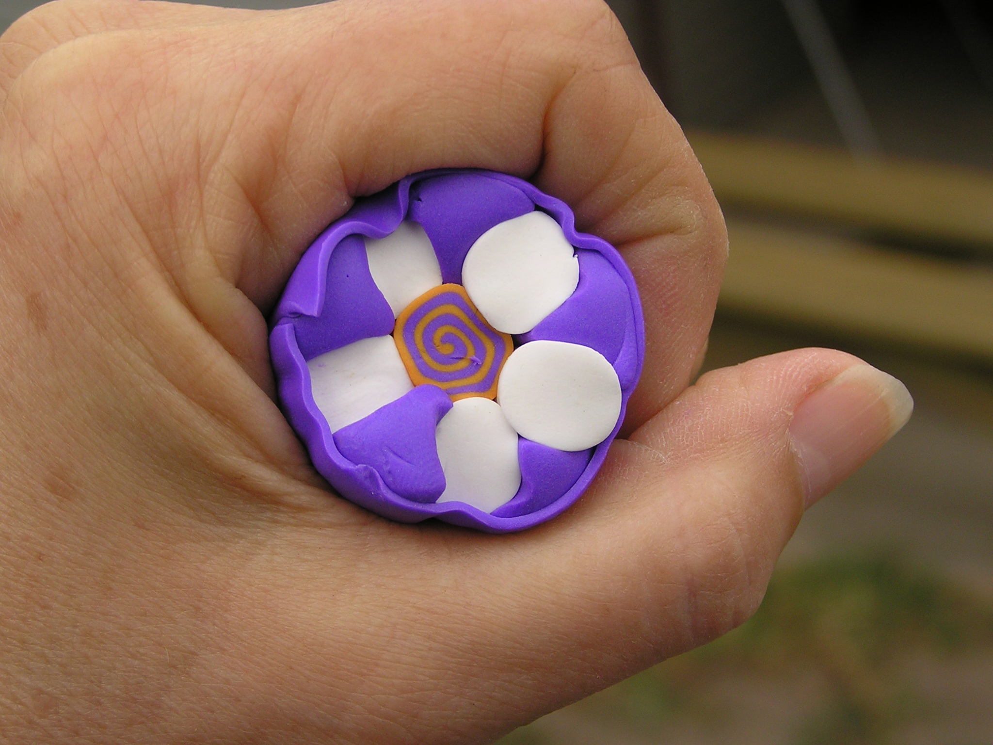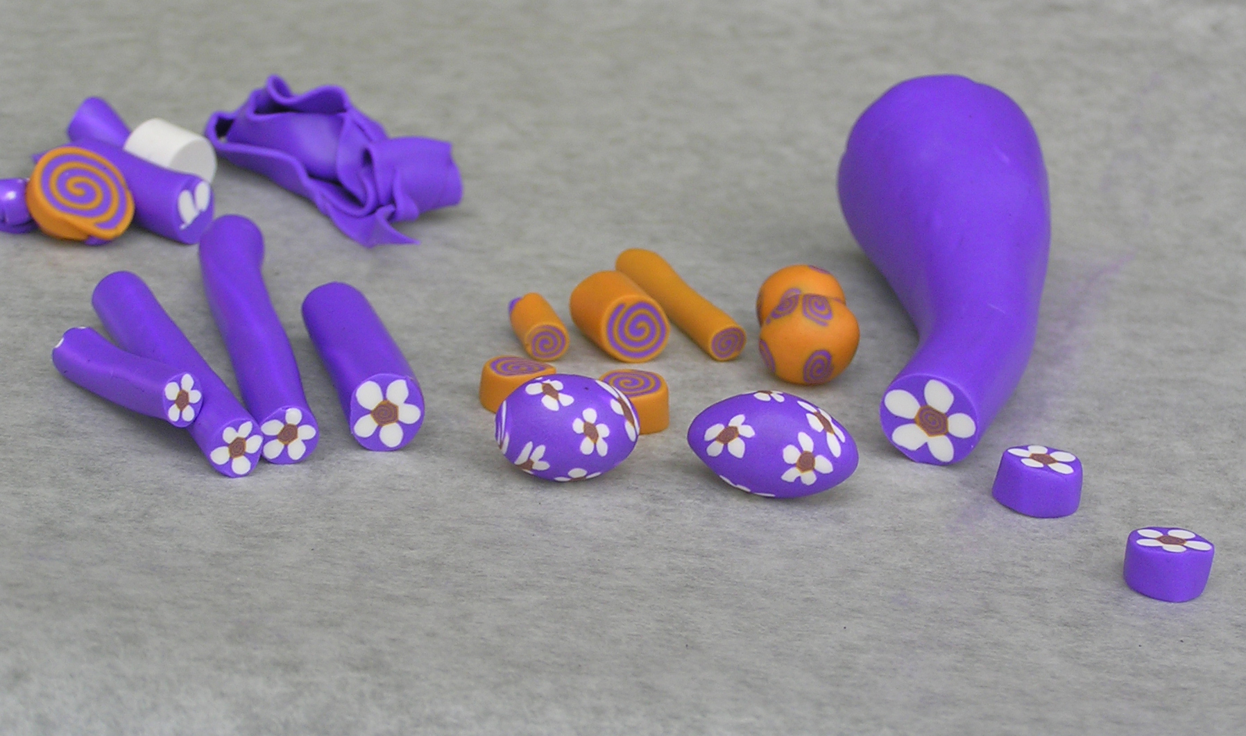 All polymer clay needs some conditioning prior to use – even if it is soft to begin with. This apparently works the plasticisers through, making the end product stronger. Take a small piece, work it with your hands, roll it into a “sausage”, fold it back on itself, then do it again. If you do this with two colors at the same time, you know it is well conditioned when the two colors become one. I’m assuming you’re starting out with one of the softer clays – if your clay is a bit hard you may need to use other techniques which may involve a pasta machine – and even a hammer! Get the feel of how the clay behaves – roll a ball, and use a pasta machine, or even a straight sided glass jar or PVC pipe to roll a thin sheet.