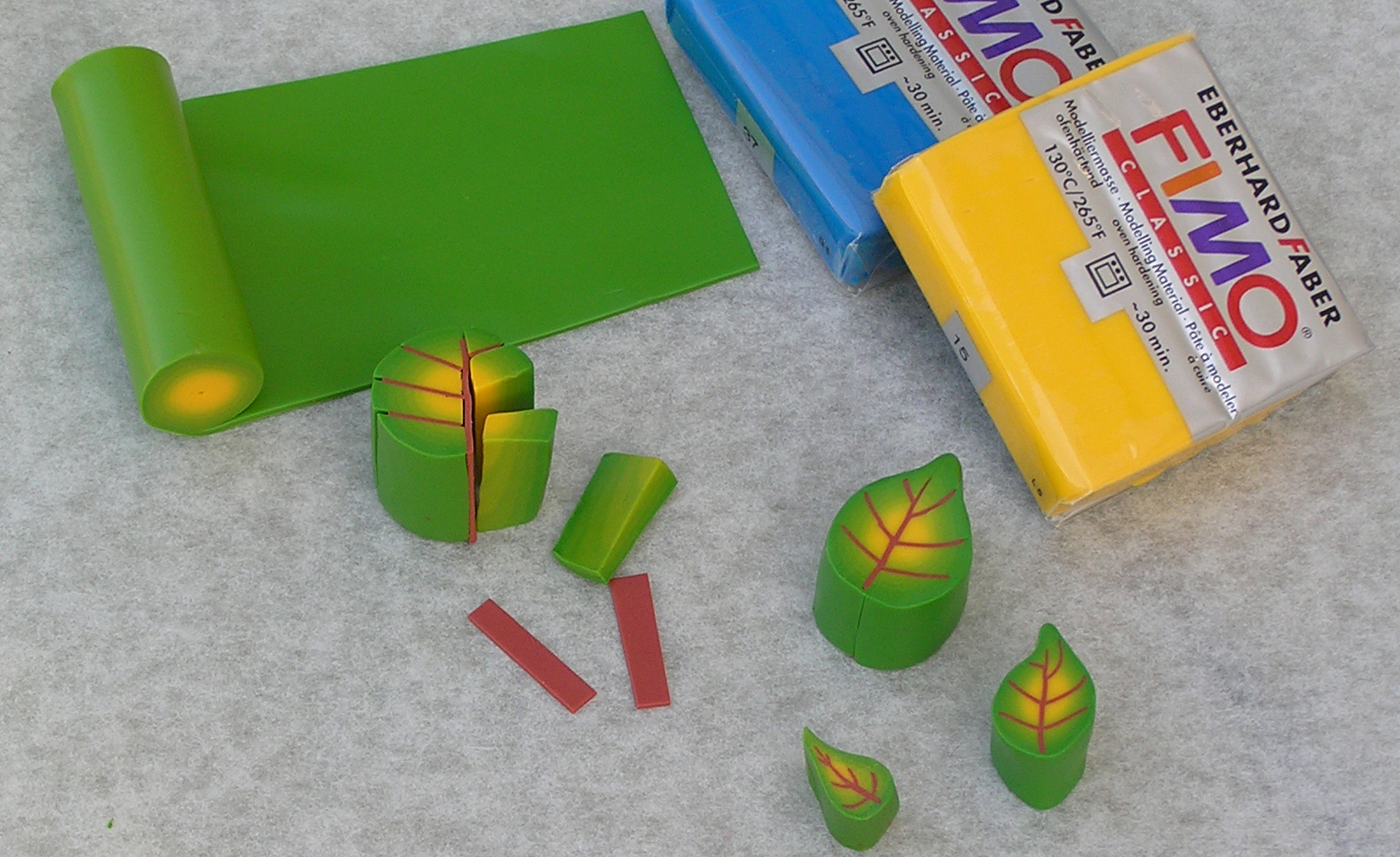 Polymer clay is a manmade material that remains pliable for long periods, but cures or “bakes” in your home oven at a fairly low temperature. Though hard when cured, thin sheets are often flexible. It can be sculpted, carved, moulded, drilled, sanded, buffed and painted. It is one of a few materials which can be made into canes with an internal pattern that is reduced in width as the cane is stretched – think of pulling millefiori glass or candies with patterns through the middle. For example, the photo shows the process of making a leaf cane, and shows the smaller sizes achieved by cutting pieces off, then gently stretching out the remainder of the cane (and so on).